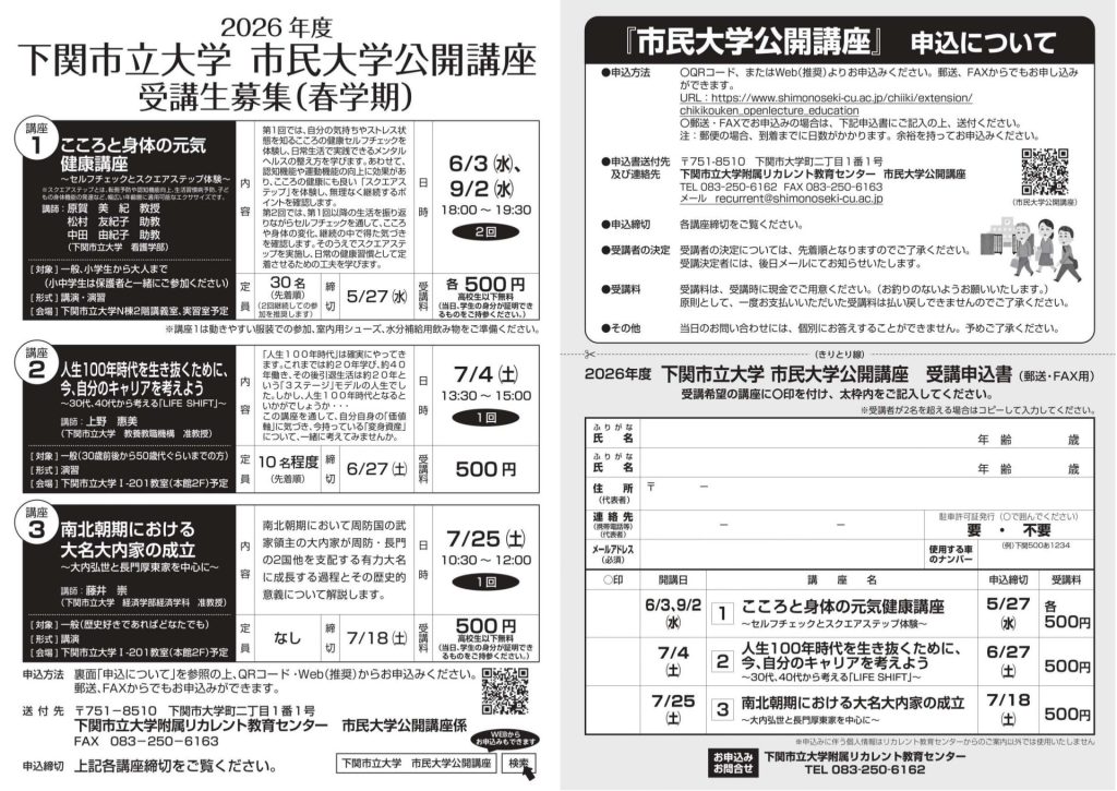 【受講生募集】附属リカレント教育センター2026年度 下関市立大学 市民大学公開講座(春学期)