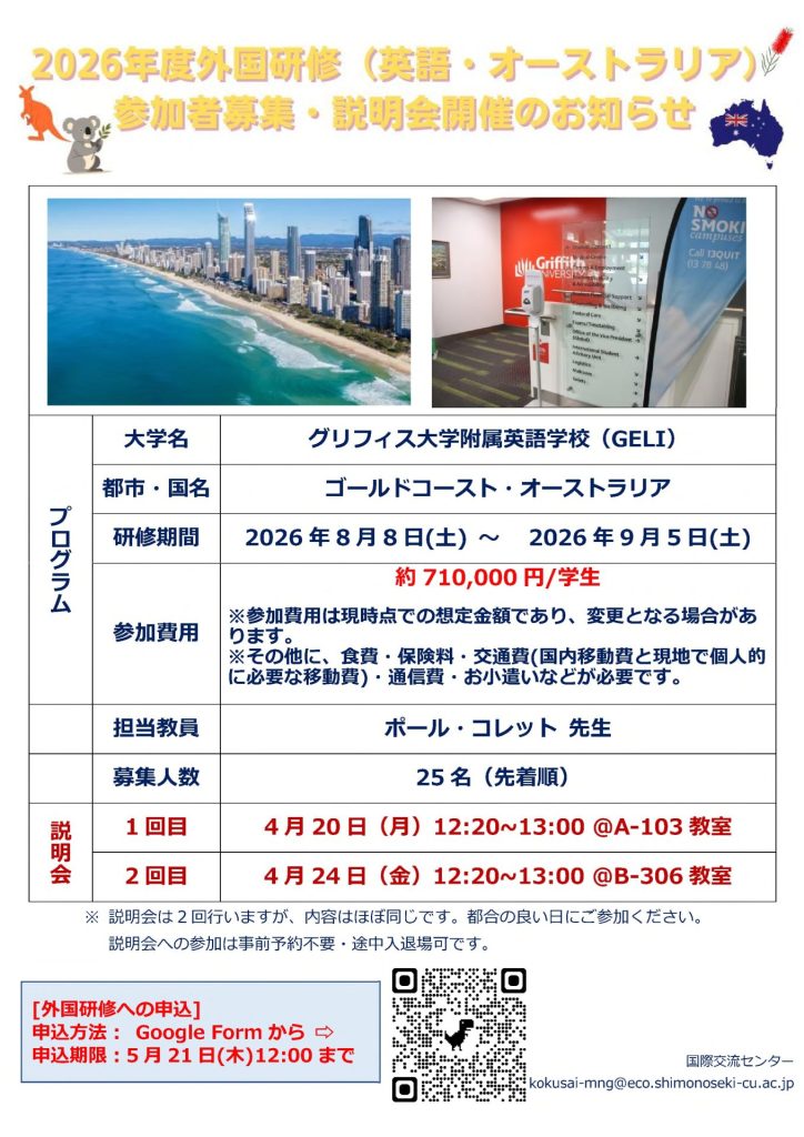 2026年度外国研修(英語・韓国語・中国語)参加者募集!説明会開催のお知らせ