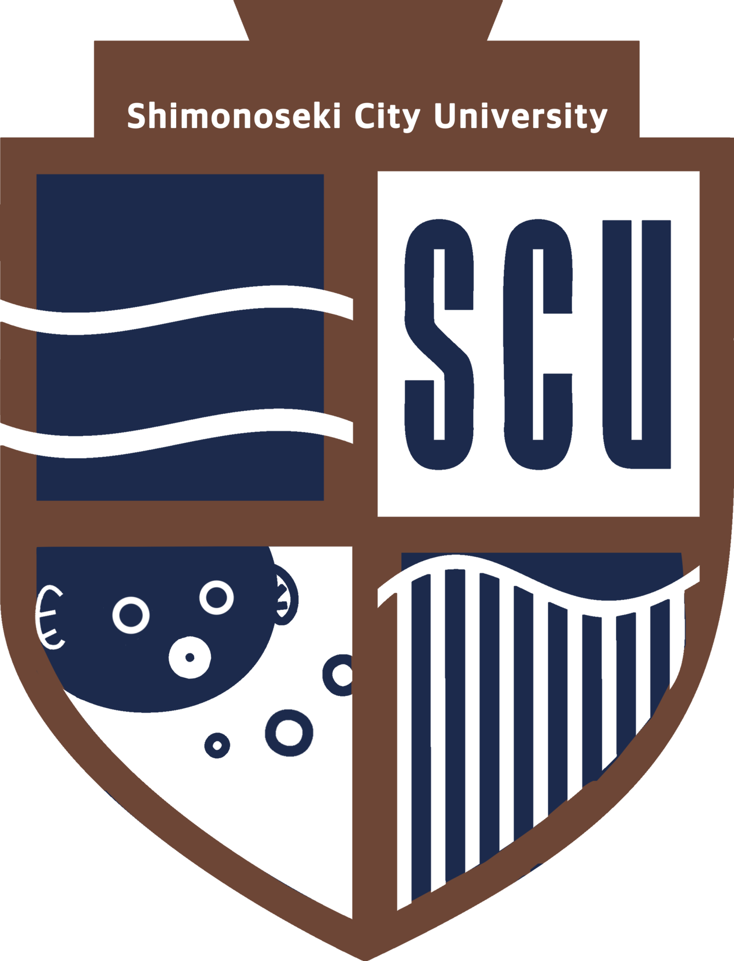「下関」の「S」をモチーフに、下関の地形と、地域の象徴である「関門海峡」をシンボライズ。地域の風土の中で培われ、育まれた個性や探究心が、勇躍と世界に羽ばたいていく様子を表す"中心の円と二つの「S」"によって、本学の理念である「地域に根ざし、世界を目指す」の精神の訴求を意図しています。