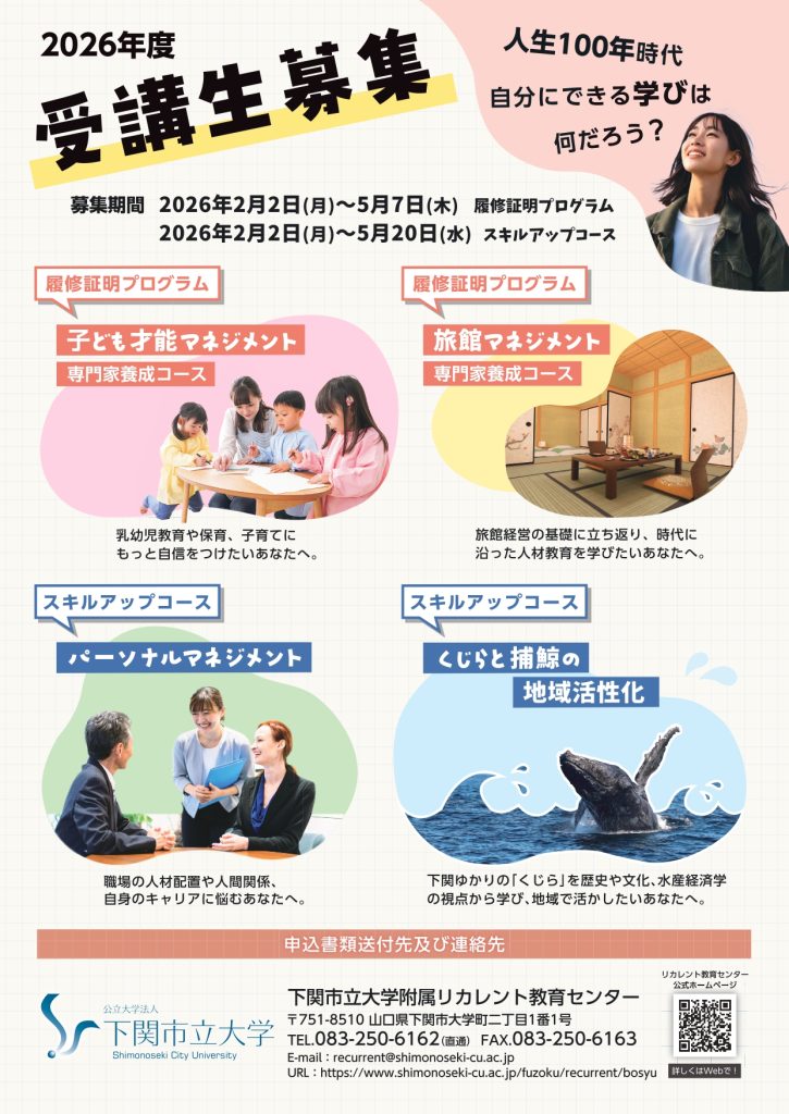 ホーム EVENT 下関市立大学 EVENT 【受講生募集】2026年度 履修証明プログラム、スキルアップコースを募集します。 2026.01.30 下関地域商社事業「沖縄大交易会」PBL報告会を開催しました 2026.01.26 2026年度第Ⅰ期派遣学生の追加募集を開始します! 2025.12.19 『鯨油ランプ・キャンドルナイト』のイベントを開催します! 2025.12.15 下関中等教育学校2回生の大学見学会を実施しました 2025.12.15 下関市立大学発、3社の新規ベンチャー企業設立の発表 2025.12.05 椋梨敬介客員教授の特別講義を実施しました 2025.11.12 インドネシアの名門ブラウィジャヤ国立大学と大学院進学・交換留学・共同研究の包括的連携に向けた学術交流協定を締結 2025.11.11 「グローバルキャリアの道」を開催します! 2025.11.07 アグリフードと観光を軸に新たな国際連携モデルの構築 ― 下関市とバトゥ市、共通の可能性をビジネスモデルへ ― 2025.11.07 東南アジア初の提携校に日本学術アカデミックセンター(下関市立大学)を開設 2025.11.05 寄附金贈呈式及び感謝状授与式を執り行いました 2025.10.31 2025年度外国研修(英語・フランス)参加者募集!説明会開催のお知らせ 2025.10.23 下関市立大学大学祭 第64回馬関祭の開催について 2025.10.15 世界トップレベルの教育・研究水準を誇るベネチア唯一の総合大学であるカ・フォスカリ大学と協定に調印 2025.10.15 12345...1020...»