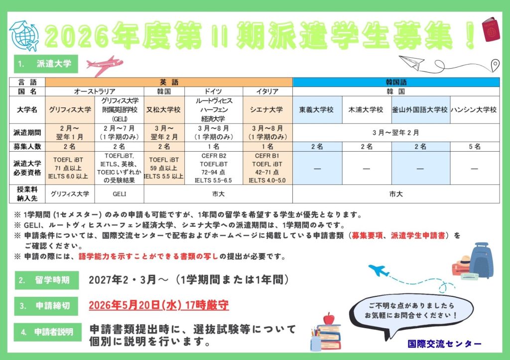 ホーム EVENT 下関市立大学 EVENT 2026年度第Ⅱ期派遣学生の募集を開始します! 2026.03.31 【受講生募集】2026年度スキルアップコースを募集します。 2026.03.27 【受講生募集】2026年度DXのためのスキルアップコースを募集します。 2026.03.02 デジコンしものせき市長表敬訪問について 2026.02.24 2025年度 第2回リーダーシップトレーニング(普通救命講習)・防災訓練に参加しました 2026.02.13 2026年度第Ⅰ期派遣学生の第2次追加募集を開始します! 2026.02.12 【受講生募集】2026年度 履修証明プログラム、スキルアップコースを募集します。 2026.01.30 下関地域商社事業「沖縄大交易会」PBL報告会を開催しました 2026.01.26 2026年度第Ⅰ期派遣学生の追加募集を開始します! 2025.12.19 『鯨油ランプ・キャンドルナイト』のイベントを開催します! 2025.12.15 下関中等教育学校2回生の大学見学会を実施しました 2025.12.15 下関市立大学発、3社の新規ベンチャー企業設立の発表 2025.12.05 椋梨敬介客員教授の特別講義を実施しました 2025.11.12 インドネシアの名門ブラウィジャヤ国立大学と大学院進学・交換留学・共同研究の包括的連携に向けた学術交流協定を締結 2025.11.11 「グローバルキャリアの道」を開催します! 2025.11.07 12345...1020...»