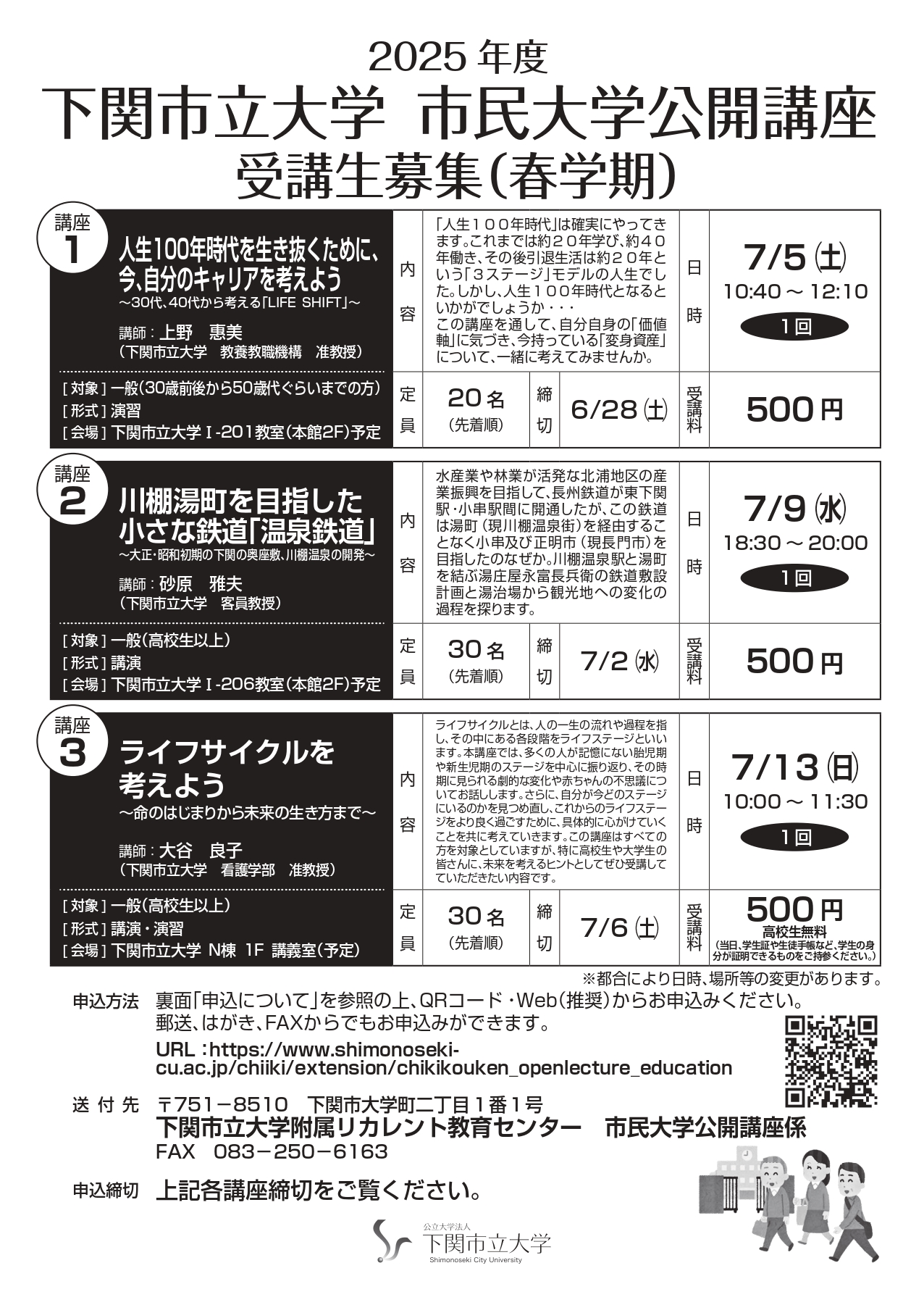 - 【受講生募集】附属リカレント教育センター 2025年度 下関市立大学 市民大学公開講座(春学期)