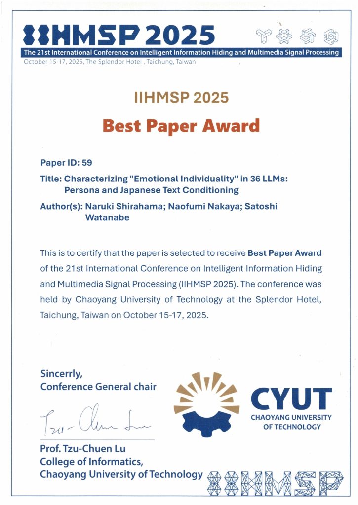 この度、本学データサイエンス学部の白濵教授が、2025年10月15日から17日にかけて台湾・台中市で開催されたThe 21st International Conference on Intelligent Information Hiding and Multimedia Signal Processing (IIHMSP 2025)において、「Best Paper Award」(最優秀論文賞)を受賞しました。この受賞は、世界をリードする7社36種類のAIモデルの「感情理解の個性」を大規模かつ統一的な手法で科学的に解明した画期的な研究が高く評価されたものです。