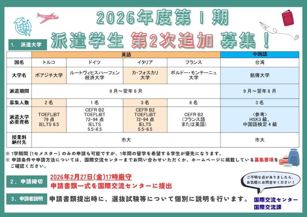 2026年度第Ⅰ期派遣学生の第2次追加募集を開始します。