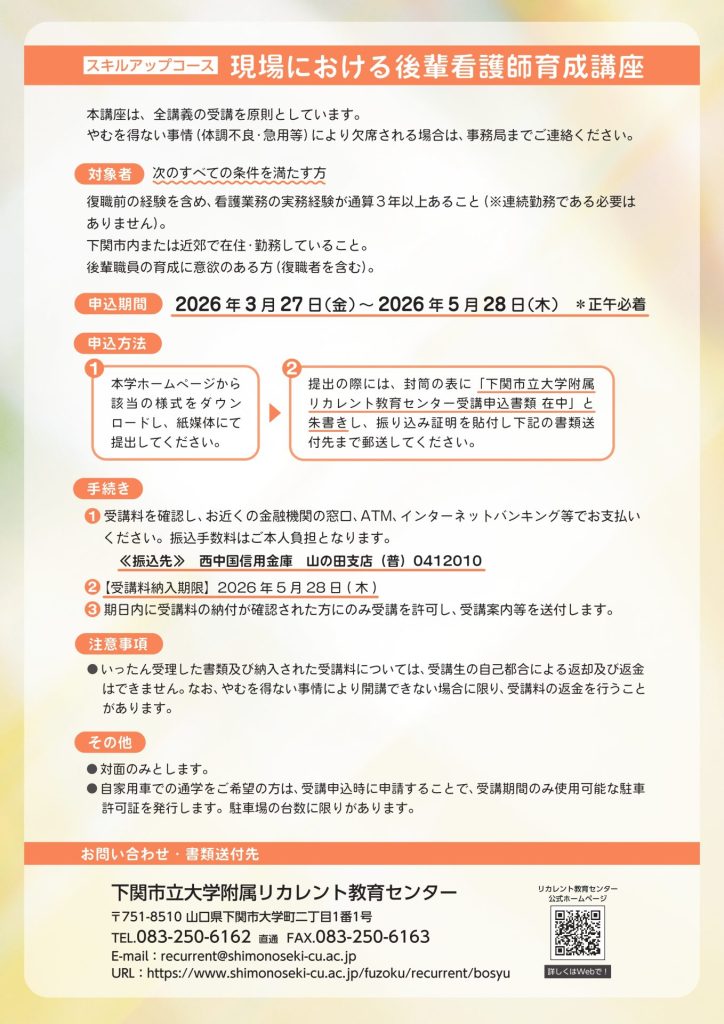 2026年度6月看護のためのスキルアップコースを募集します。