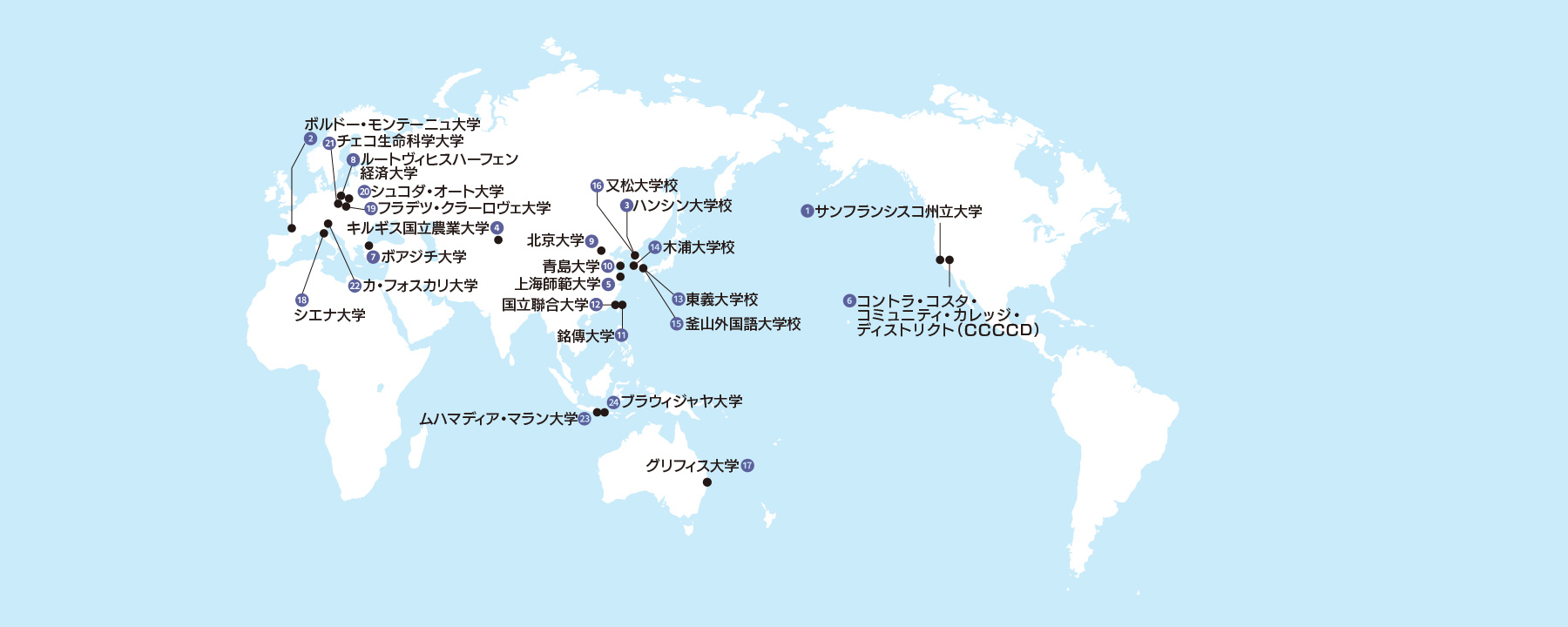 ホーム 国際交流 留学データ 交流協定校 留学データ 交流協定校 ❻ コントラ・コスタ・コミュニティ・カレッジ・ディストリクト(CCCCD) ロス・メダノス・カレッジ(LMC) アメリカ/ピッツバーグ市 ディアブロ・バレー・カレッジ(DVC) アメリカ/プレザントヒル市 コントラ・コスタ・カレッジ(CCC) アメリカ/サンパブロ市 1 サンフランシスコ州立大学 アメリカ/サンフランシスコ 2 ボルドー・モンテーニュ大学 フランス/ペサック 3 ハンシン大学校 韓国/ソウル特別市 4 キルギス国立農業大学 キルギス/ビシュケク市 5 上海師範大学 中国/上海市 7 ボアジチ大学 トルコ/イスタンブール市 8 ルートヴィヒスハーフェン経済大学 ドイツ/ルートヴィヒスハーフェン アム ライン市 9 北京大学 中国/北京市 10 青島大学 中国/青島市 11 銘傳大学 台湾/台北市 12 国立聯合大学 台湾/苗栗市 13 東義大学校 韓国/釜山広域市 14 木浦大学校 韓国/務安郡 15 釜山外国語大学校 韓国/釜山広域市 16 又松大学校 韓国/大田広域市 17 グリフィス大学 オーストラリア/ブリスベン市 18 シエナ大学 イタリア/シエナ市 19 フラデツ・クラーロヴェ大学 チェコ共和国/フラデツ・クラーロヴェ市 20 シュコダ・オート大学 チェコ共和国/ムラダー・ボレスラフ市 21 チェコ生命科学大学 チェコ共和国/プラハ市 22 カ・フォスカリ大学 イタリア/ヴェネツィア市 23 ムハマディア・マラン大学 インドネシア/マラン市 24 ブラウィジャヤ大学 インドネシア/マラン市