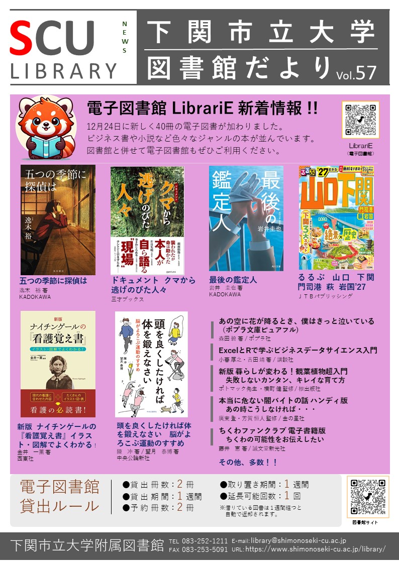 学内 2025.12.24 図書館だより第57号 共通 2025.10.27 下関市立大学図書館システム更新業務における受注候補者について 学内 2025.10.14 Scopus・Web of Scienceの利用講習会を開催します。 学内 2025.09.29 図書館だより第56号 学内 2025.09.29 図書館だより第55号 学内 2025.07.17 夏季休業期間に伴う長期貸出について 学内 2025.07.10 初めてデータベースや電子ジャーナル等を学内や学外から使う方法について 学内 2025.05.23 (ご報告)医中誌Webから外部サイト論文をダウンロードする際のエラー解消について 学内 2025.05.23 (予告)OpenAthesの更新作業について 学内 2025.05.20 (続報)医中誌Webから外部サイト論文をダウンロードする際のエラーについて 1 / 512345»