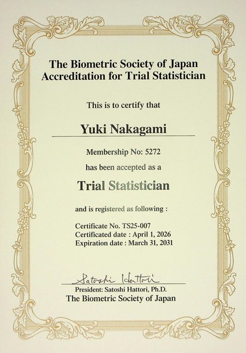 臨床試験おいては日・米・EU三極医薬品規制調和国際会議の「臨床試験のための統計的原則」(ICH-E9ガイドライン)にて、試験の計画段階から試験統計家が関与することの必要性が示されていますが、日本国内においては試験統計家がまだ少ないというのが現状です。このような状況の中、一般社団法人日本計量生物学会により「臨床研究の統計的デザインと解析・統計家の行動基準に関し深い知識を有し、実践している者」を試験統計家として認定する試験統計家認定制度が2017年より開始されました。本制度で認定する試験統計家には「実務試験統計家」と「責任試験統計家」の2種類があり、2025年4月時点でそれぞれ約80名と約30名が認定されています。