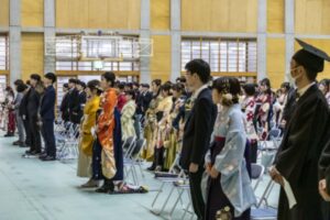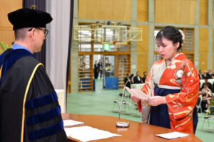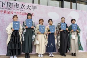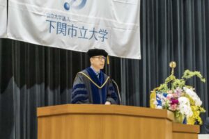 式では、韓学長の告辞や前田下関市長の来賓祝辞に、国際商学科の茨木美穂さんが卒業生代表謝辞を述べました。