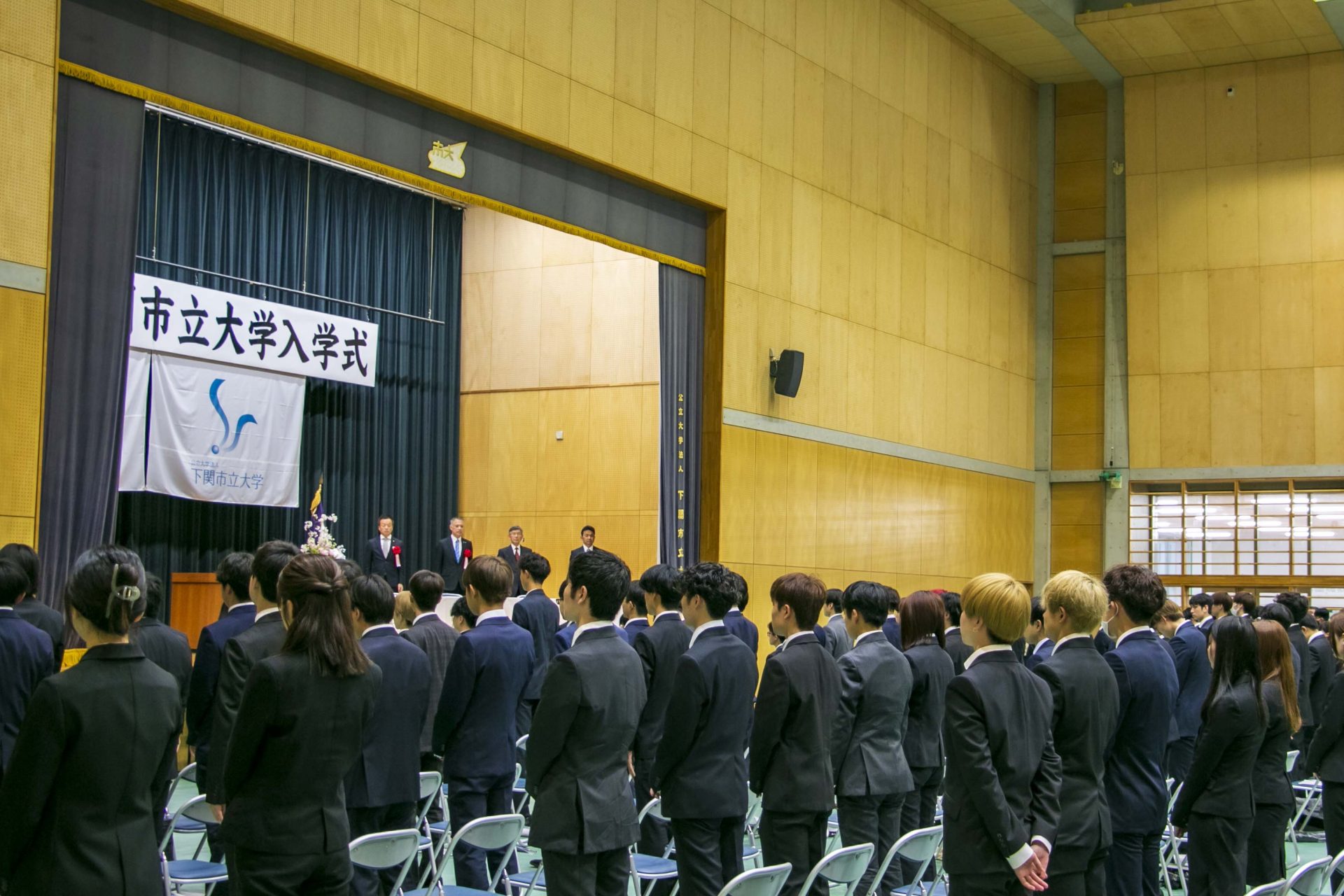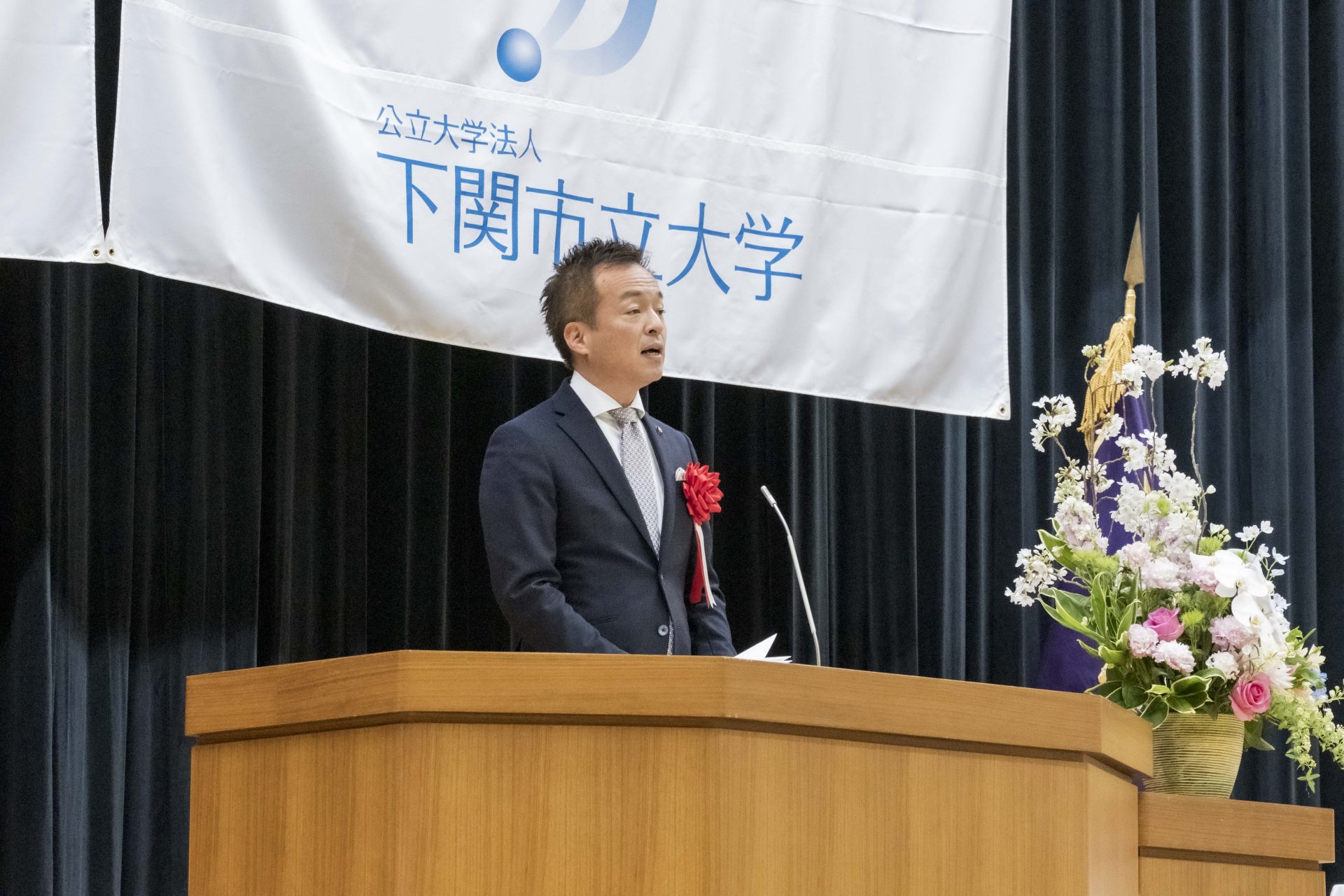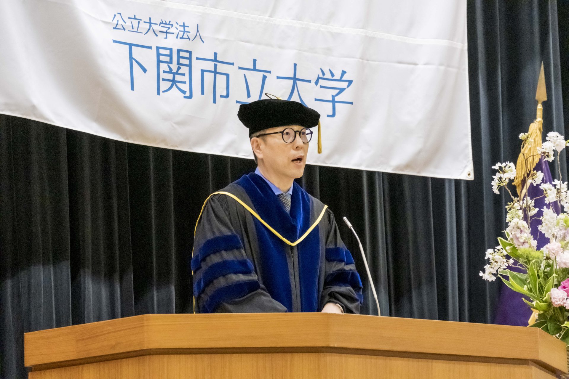 厳かな雰囲気の中式典が始まり、入学生として、経済学部生435名(うち留学生13名)、データサイエンス学部生88名、編入学生18名、大学院経済学研究科生9名、特別支援教育特別専攻科生6名の合計556名が本学の仲間入りをしました。