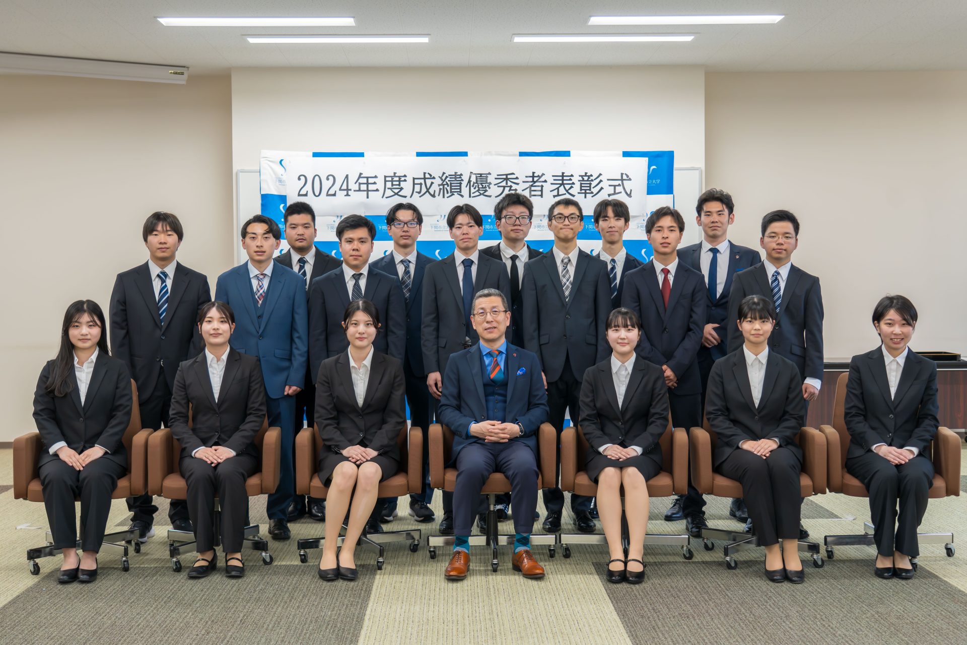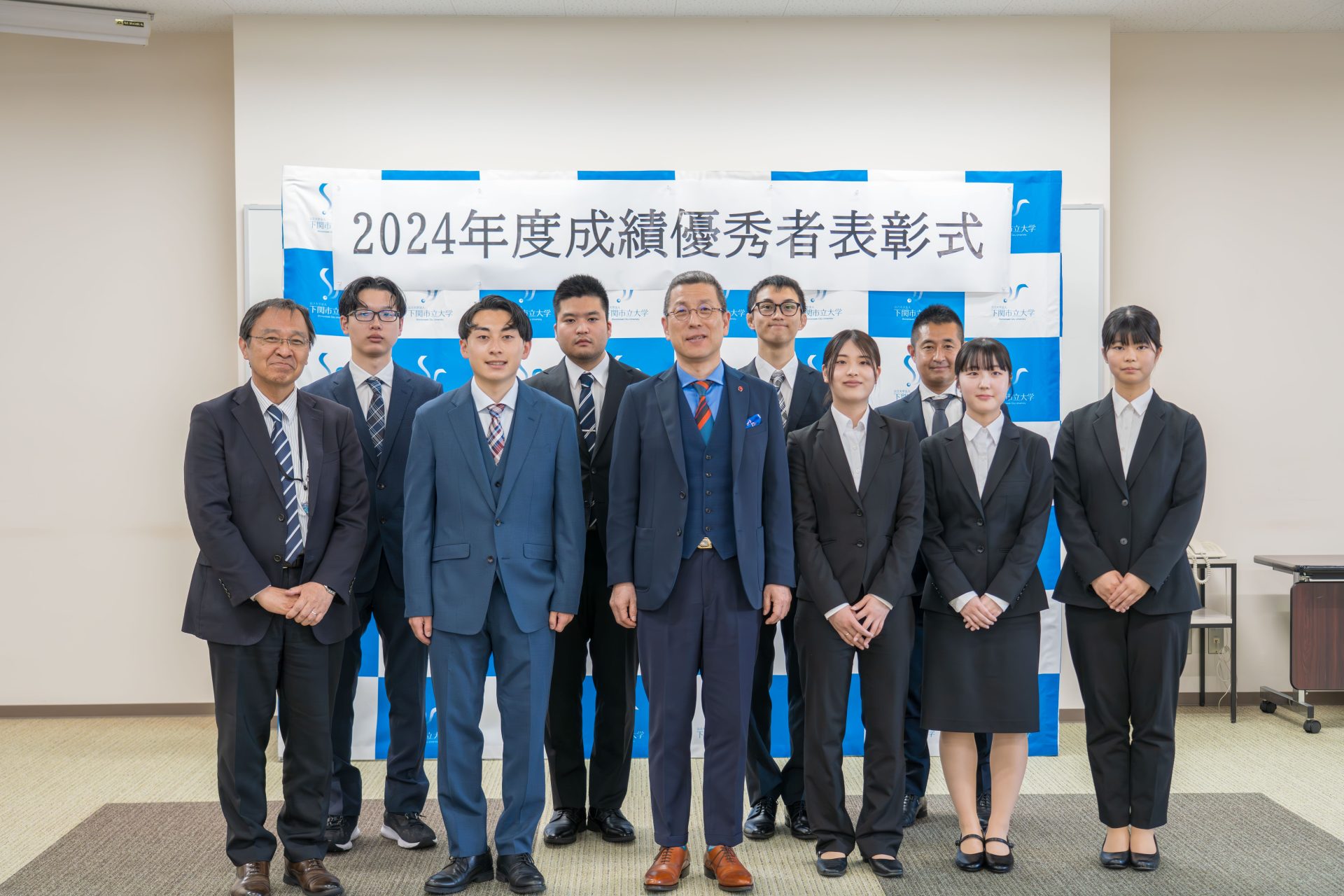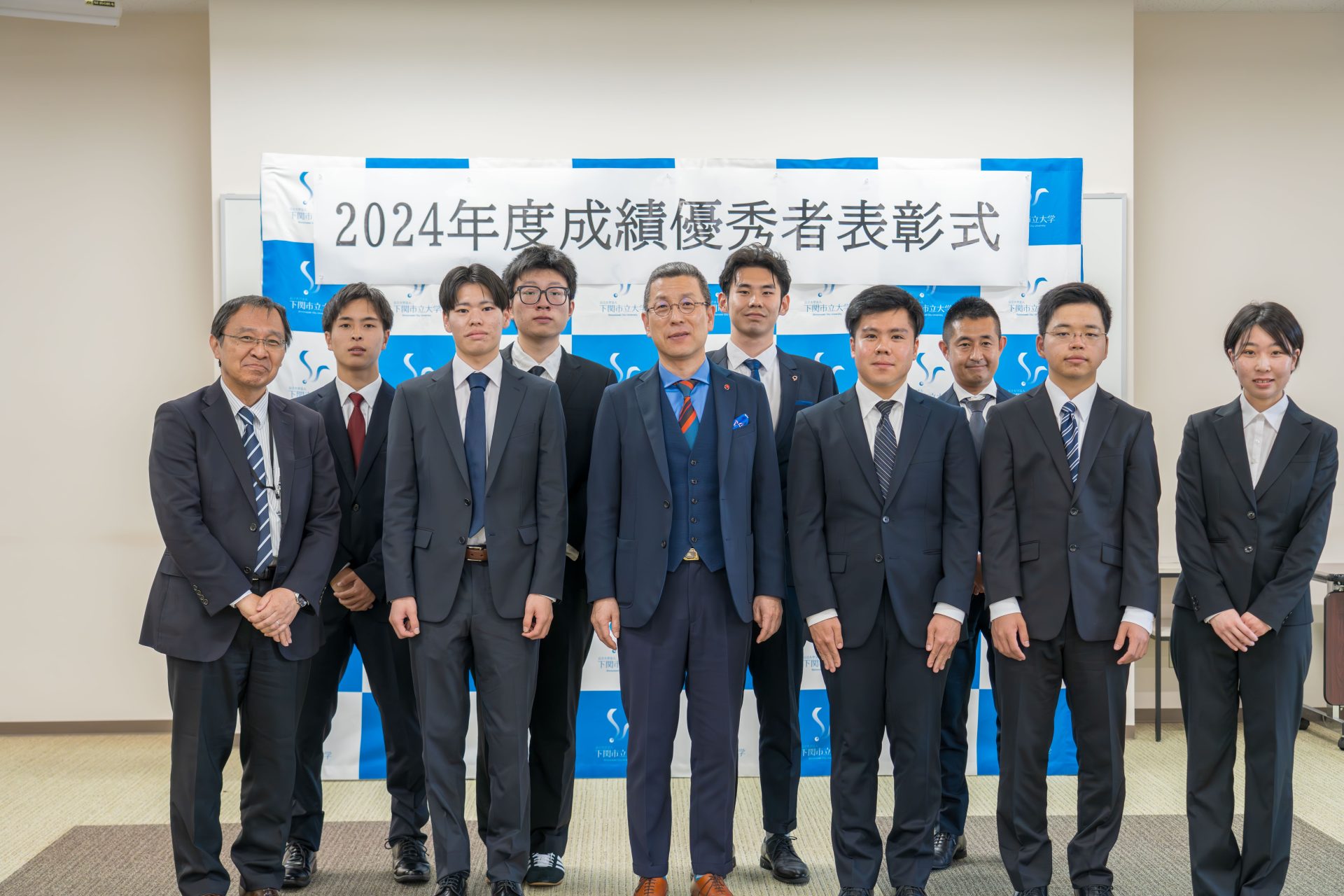 経済学科20名、国際商学科19名、公共マネジメント学科6名、データサイエンス学科3名、留学生2名、計50名が受賞し韓学長から表彰状が渡されました。その後学長から学生への激励の挨拶があり、初めは緊張の面持ちの学生達も次第にそれが和らぎ、最後は打ち解けた雰囲気の中、記念撮影を行い終了しました。