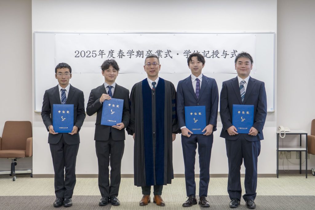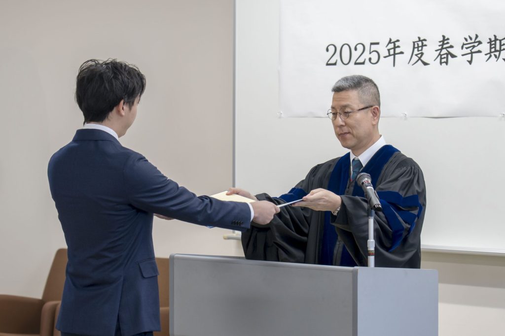 9月30日(火)、本学において、2025年度春学期卒業式・学位記授与式を挙行し、経済学科7名、国際商学科5名、公共マネジメント学科3名の計15名が本学を巣立っていきました。