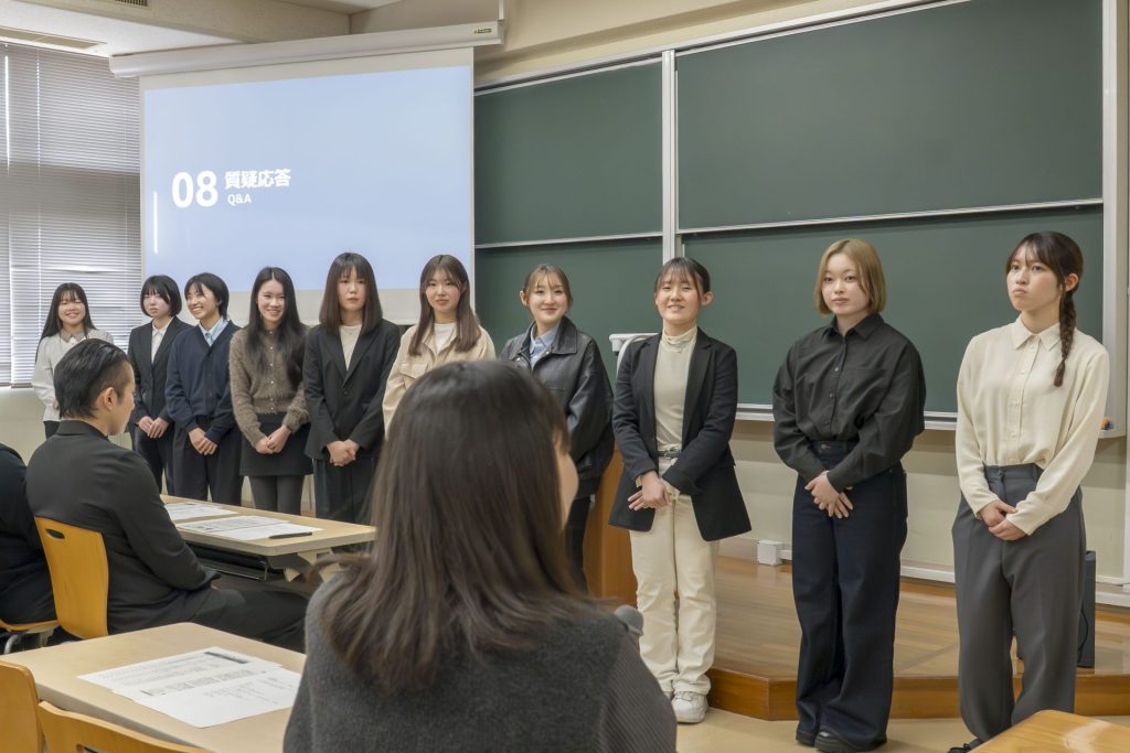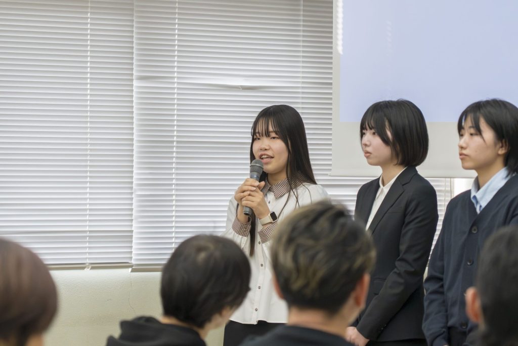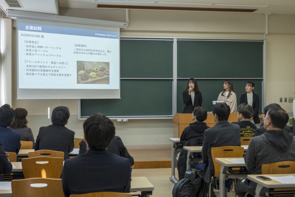 学生10人が登壇し、商談会に向けた事前準備や当日の様子、得られた成果や今後の課題について報告しました。学生は、企業を訪問して商品への理解を深め、パンフレットやPR動画の制作にも挑戦しました。商談会当日はPRブースで試食対応や資料配布、商品の魅力を伝える説明などを担当し、バイヤーから関心や評価を得ることがでました。