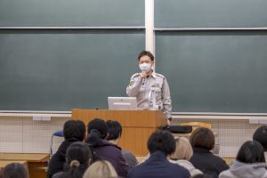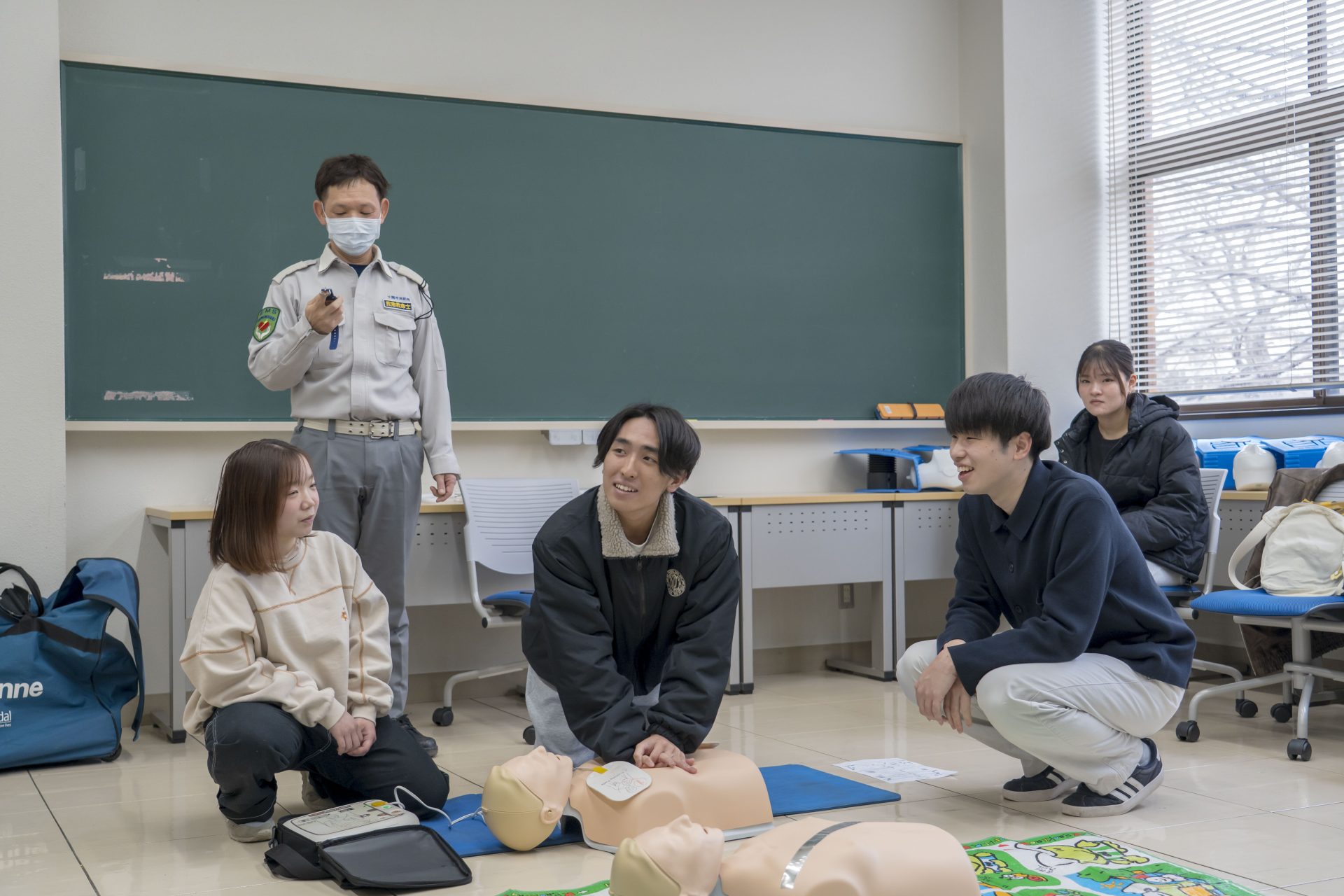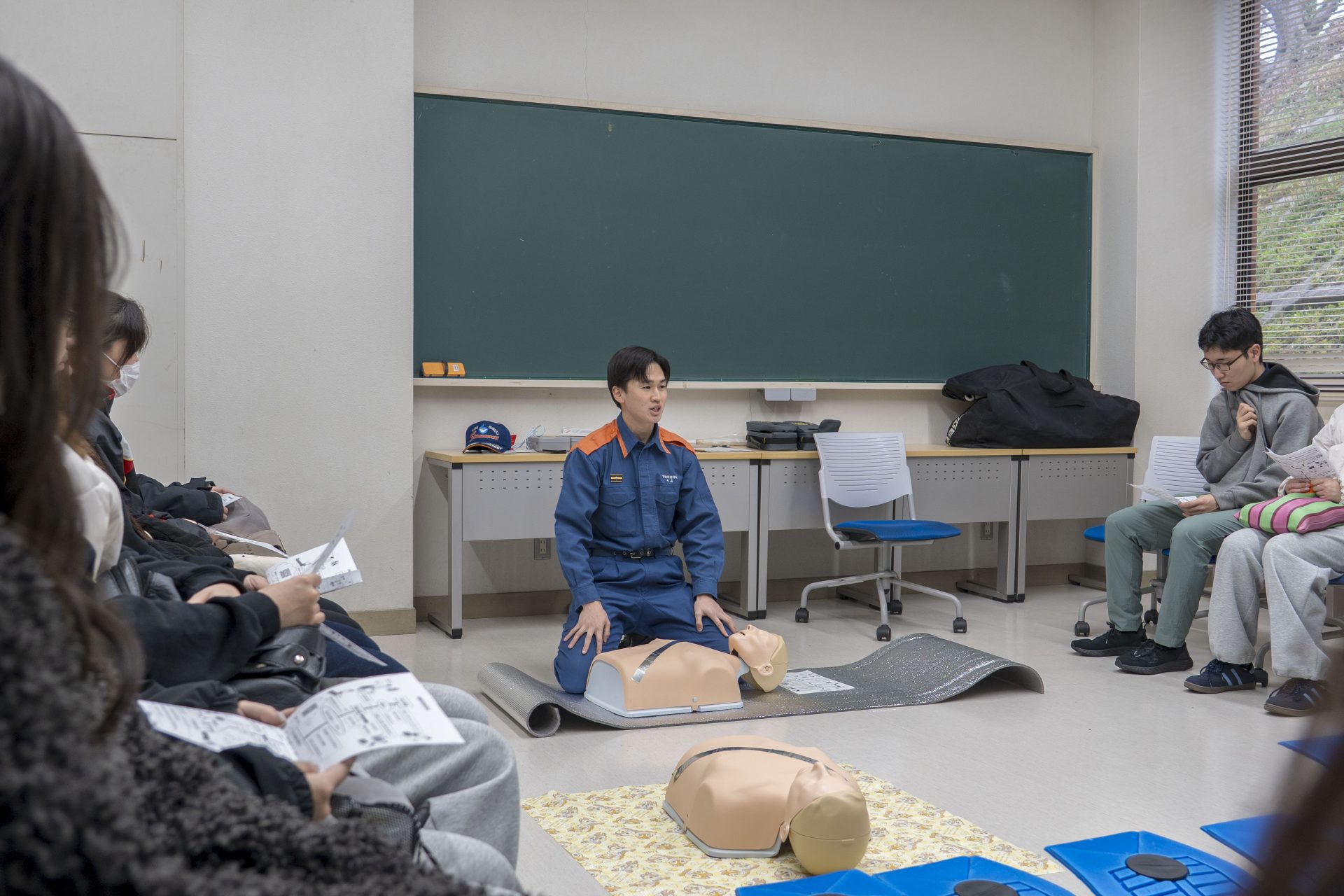 第2回目は下関市北消防署より講師をお招きし、「普通救命講習」が行われました。胸骨圧迫やAEDの使用による心肺蘇生法のほか、搬送法等について習得しました。
