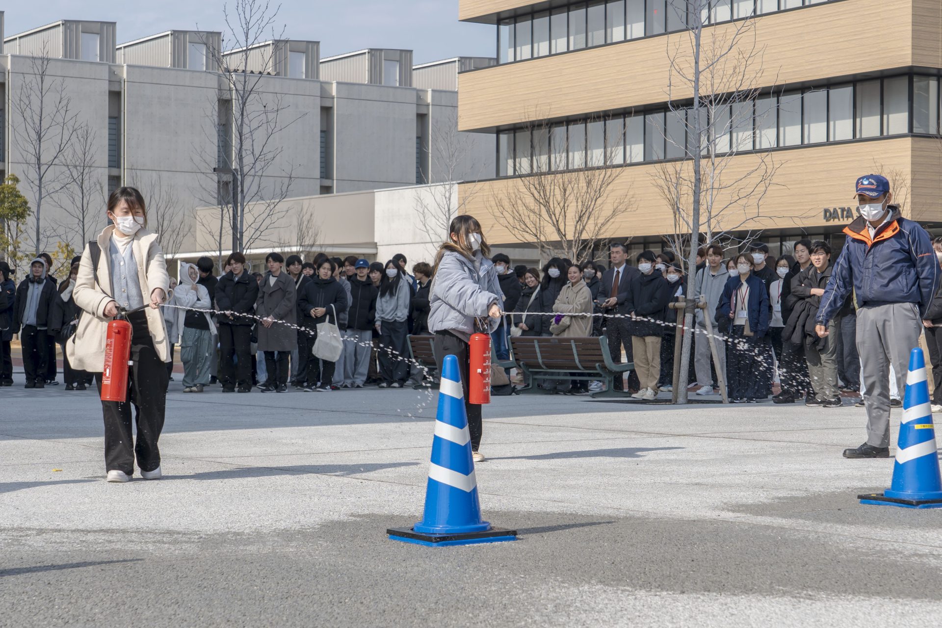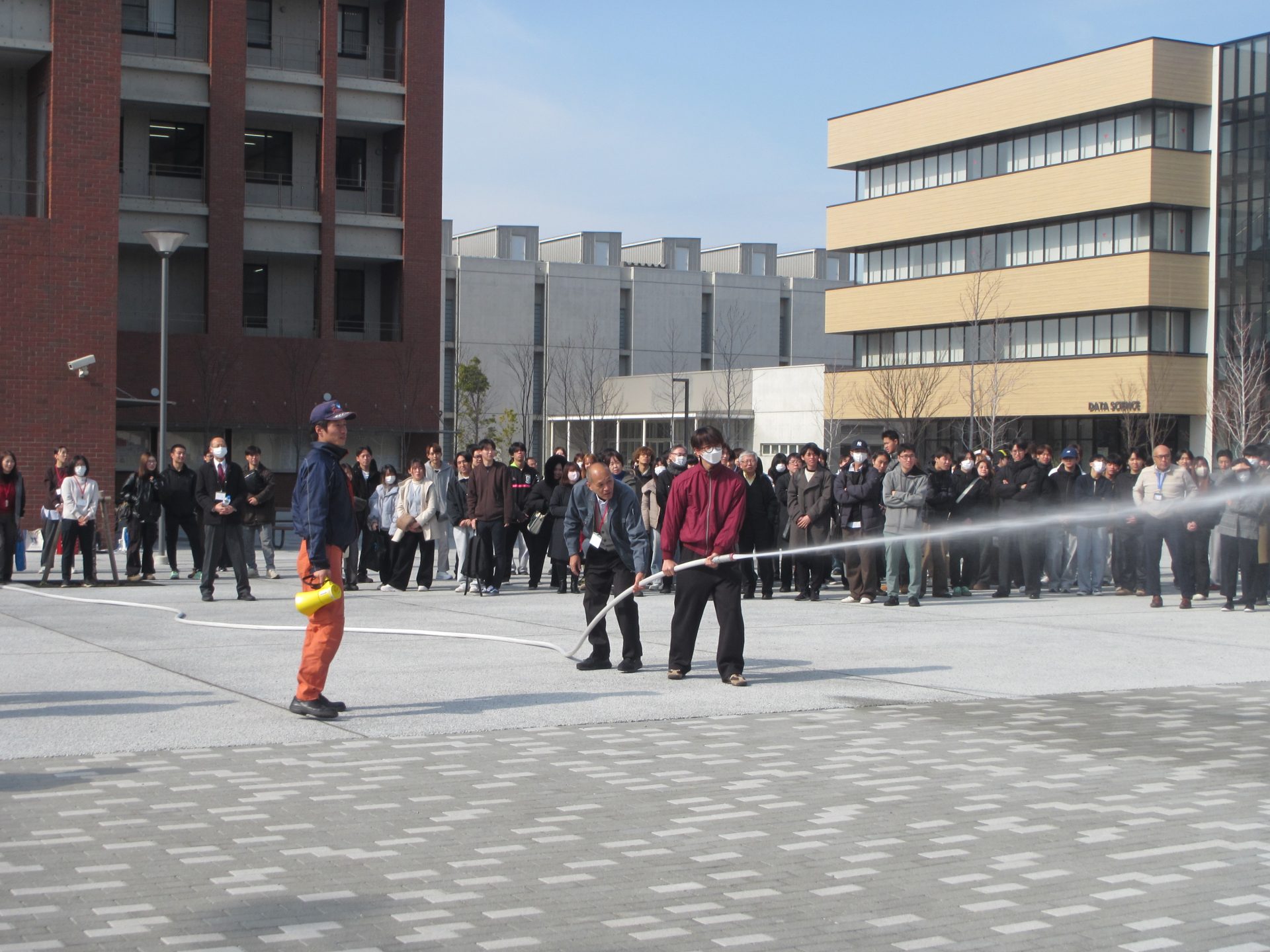 リーダーシップトレーニングの会場でもあるB講義棟2階で火災発生と想定して行われ、火災警報器から発せられた発報を受け、職員の避難誘導に従って避難場所である本館Ⅰ棟掲示板前広場に避難しました。その後、消防署員から水消火器や屋内消火栓の使用について説明があり、実際に操作し放射しました。